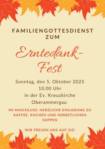 By stephanfe30. September 2025 Sonntag, 5. Oktober 2025 10 Uhr in der Ev.-Luth. Kreuzkirche Oberammergau Im Anschluss: Herzliche Einladung zu Kaffee, Kuchen und herbstlichen Suppen. Wir freuen uns auf Sie! Link zum Plakat hier klicken!